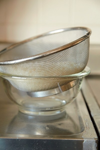 (4)架起濾網過濾以防止白米流失。將濾網斜放並靜置在稍小的碗,就可以把水過濾乾淨。