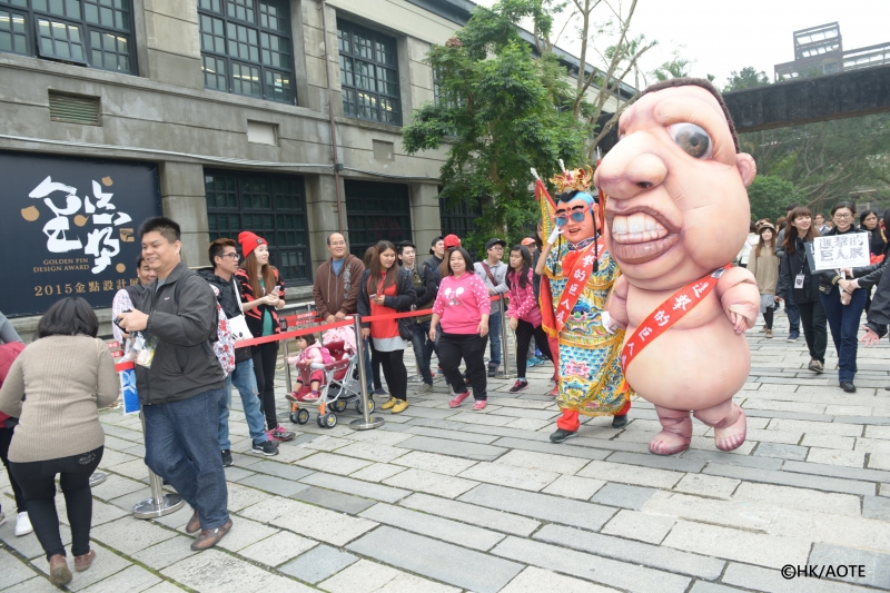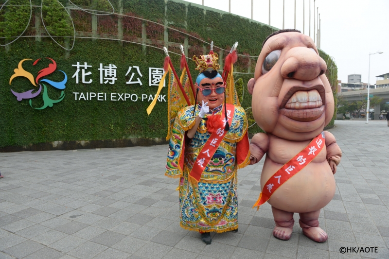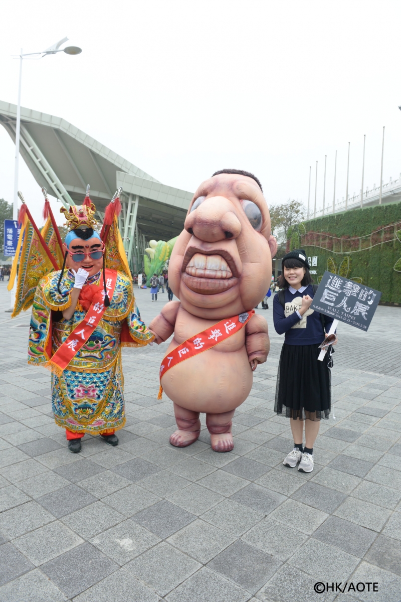 元旦假期來臨,台北有許多展覽開始展出,戰況激烈,在松山文創園區展一號倉庫展出的「進擊的巨人展WALL TAIPEI」,為了拉抬人氣,特別情商請來了雲林北港朝天宮的正宗電音三太子北上助陣,和巨人展的吉祥物小巨人,一起進行快閃活動,分別到花博、信義商圈、西門町以及巨人展等地,每到一個地點,都會被人群包圍攔下來,人氣相當旺,在地的三太子還會照顧日本來的小巨人,手牽手往前走,萌爆現場的觀眾,三太子還會學調查兵團「獻出心臟」的招牌動作,形成超有趣的畫面。