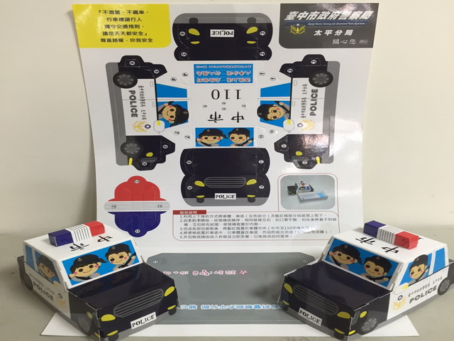 太平警分局防制酒駕宣導搞創意,警方特製「Q版警車便條紙組合」宣導品,以紙模型方式設計,讓民眾可以自己動手組成一台屬於自己的警車,警方還在小警車印有交通宣導標語,宣導民眾勿酒後駕車及交通安全觀念,可愛造型及實用性大受小朋友及家長們喜愛。