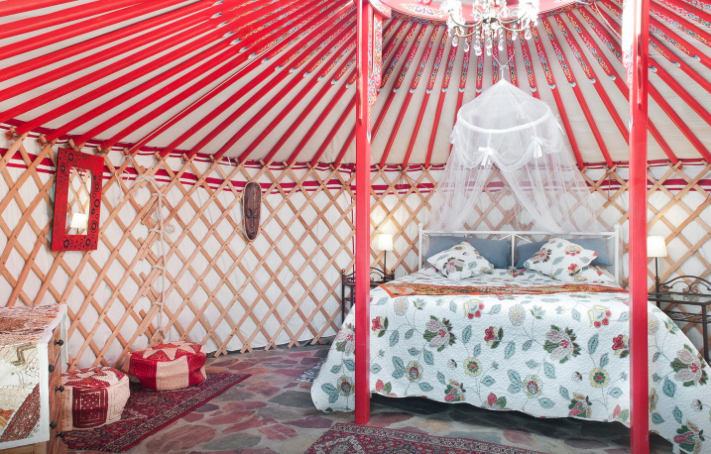 蒙古包不是應該出現在蒙古的青青草原上跟牛馬們同居嗎?這紅色系的佈置根本是公主夢中才會出現的房間呀!除了臥房外,另一個蒙古包還有妳私人的淋浴間和廁所,夏天還能在戶外廚房跟泳池邊BBQ,享受美麗的自然景觀,實在是夢幻到不行!