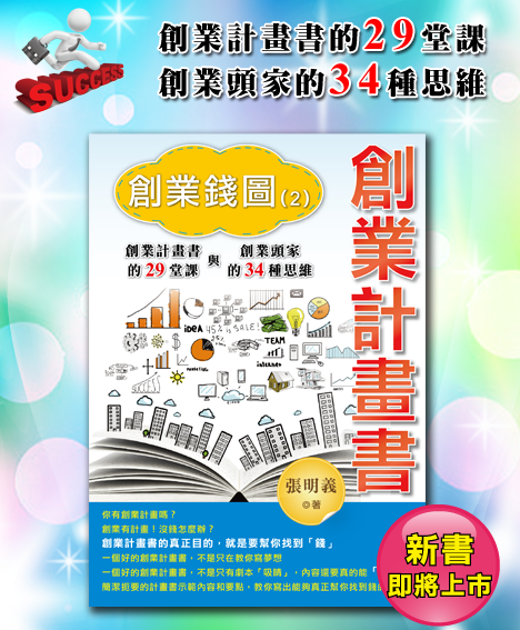還記得《創業錢圖-創業籌資及股權安排設計》嗎,跳脫一般創業書籍,以創業籌資及股權角度,帶給讀者全新的資訊,推出即廣受好評,而作者張明義再度推出續作《創業計畫書-創業錢圖(2)》,這次將教大家29堂設計創業計畫書該注意的「眉眉角角」,以及創業頭家才會有的34種思維,讓創業的朋友利用籌資、設計創業計畫,輕鬆抵達成功創業之路!