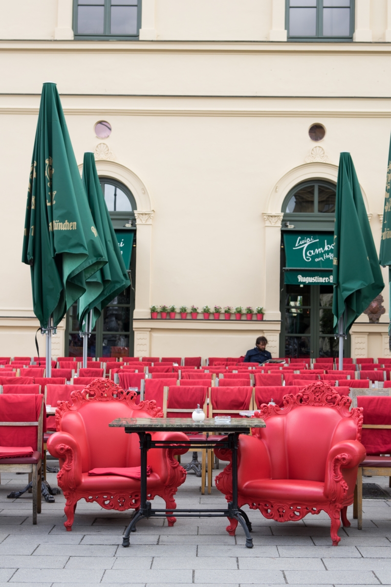 這天起了大早捕捉到沒有燦爛陽光時的空曠景象,與平常好天氣裡座無虛席的景象相比實在天壤地別。咖啡館前一對紅色華貴座椅即使與不認識的陌生人共桌而坐,窩進座椅裡也跌進自己的世界,抓本書捧著筆電就是另一個世界。