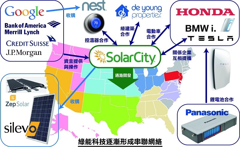 除了新技術外,王孟傑表示,綠能科技已經逐漸形成串聯網絡。以美國太陽能租賃龍頭SolarCity為例。SolarCity過去曾和綠建築商De Young Properties建立合作關係,並在2013年8月以1.2億美元的價格收購了太陽能銷售公司Paramount Solar,同年10月以1.58億美元收購太陽能電池模組新創公司Zep Solar,2014年又以2億美元收購同樣是新創公司的高效能太陽能電池面板廠Silevo。