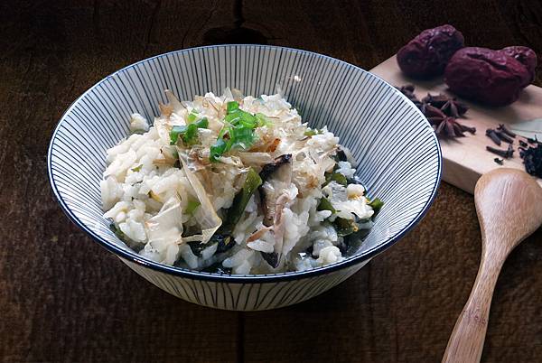 在這道【老火鍋柴魚香菇炊飯】的用料上,有柴魚,香菇,海帶芽,蔥,當然還有蛋