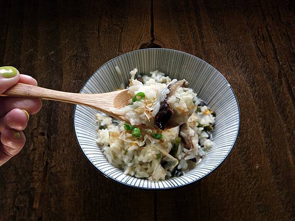 5.當湯汁收乾,米飯濃稠後關火,接著淋上蛋汁,加入柴魚和蔥即可完成!