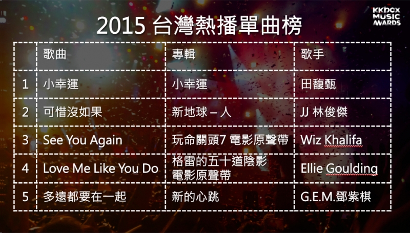 ▲KKBOX公佈2015年台灣熱播單曲榜,榜單跨越語言,貼近時事!