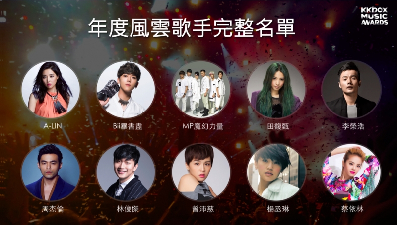 KKBOX在台灣、日本、香港、新加坡、馬來西亞與泰國等地,去年共有超過90億次的點播數,而排名前十名的「年度風雲歌手」,無疑是年度人氣指標。從今年年度風雲歌手名單中,可看出許多天王天后的專輯歌曲,仍是引領歌壇的風向球,包括多次入榜的金曲歌王「JJ林俊傑」、全能天后「楊丞琳」、天生歌姬「A-LIN」、亞洲天王「周杰倫」、流行天后「蔡依林」及超人氣小天后「田馥甄」,都是KKBOX風雲榜的常客,創作才子「李榮浩」則堪稱是KKBOX近年的「大黑馬」急起直追;而人氣新秀「Bii畢書盡」、電音搖滾第一團「MP魔幻力量」及陪伴系溫暖女聲「曾沛慈」,都曾演唱或主演偶像劇主題曲,在歌曲及戲劇的成功結合下,成為粉絲收聽及收看的點播保證!