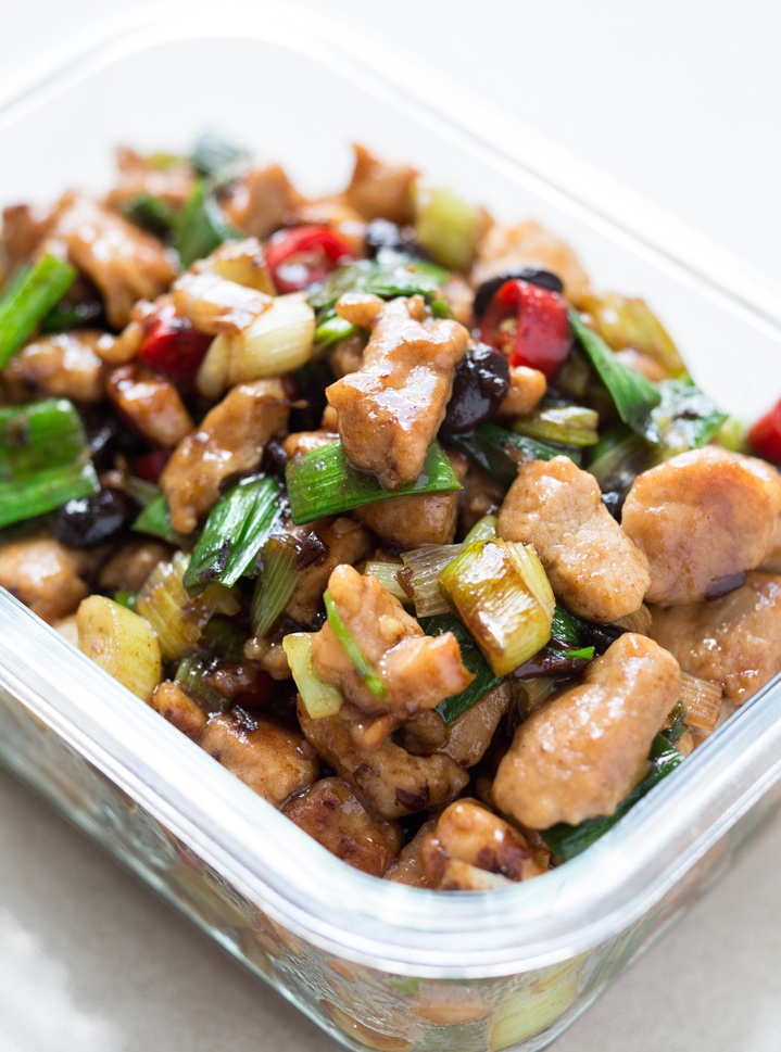 2. 爆香調味:原鍋加油,爆香蒜白、青蔥與辣椒,加入甘味豆豉、米酒等其他調味料,豬肉回鍋,大火炒乾,撒下蒜綠,翻拌起鍋。