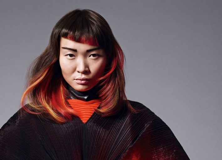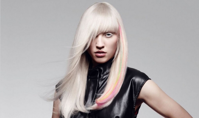 × 打破一貫色彩潮流。同時混合了光與暗,不同色調間的相互融合,形成了美麗的光影遊戲,淺金髮色與炫光色彩各據一方,徹底瓦解,創造色彩的動感錯覺。