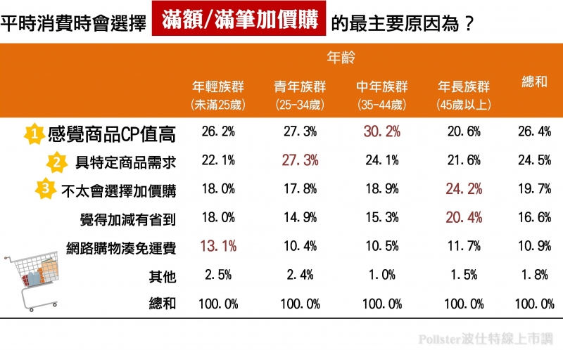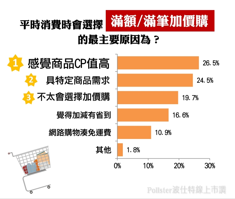 Pollster波仕特線上市調網針對1,571位受訪者詢問「請問您平時消費時會選擇『滿額/滿筆加價購』的最主要原因為?」。調查結果發現受訪者想要「加價購」之因素以「感覺商品CP值高」為大宗,占整體受訪者之26.5%,「具特定商品需求」以24.5%居於第二,再其次則為「覺得加減有省到」16.6%與「網路購物湊免運費」10.9%,不過亦有近兩成(19.7%)受訪者表示「不太會選擇加價購」。從結果可發現,相較於加價購商品是否「符合需求」,多數民眾選擇加價購的主要原因在於「商品本身CP值」。表示對部分民眾而言,倘若知覺到商品價值遠高於售價,即便目前暫時無此商品之需求,仍可能選擇「加價購」。