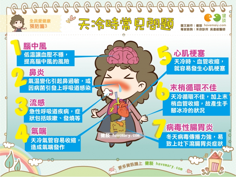 3. 氣喘:氣喘是一種慢性支氣管發炎與過度反應的疾病。天冷時容易誘發氣管收縮造成急性氣流阻滯時,就會發作。