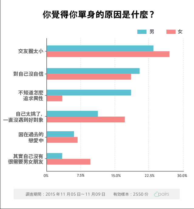 為什麼我會單身?pairs派愛族進一步詢問:「你覺得你單身的原因是什麼?」結果發現,單身前五名的原因分別是:「交友圈太小」、「對自己沒自信」、「不知道怎麼追求異性」、「自己太挑了,一直沒有遇到好對象」、「困在過去的戀愛中」,以及「其實自己沒有很需要男女朋友」。