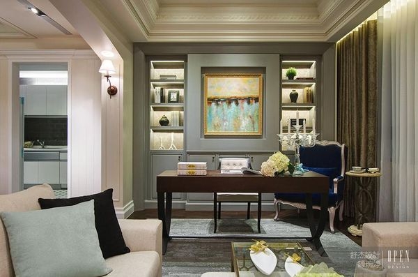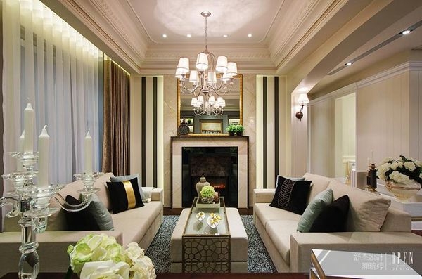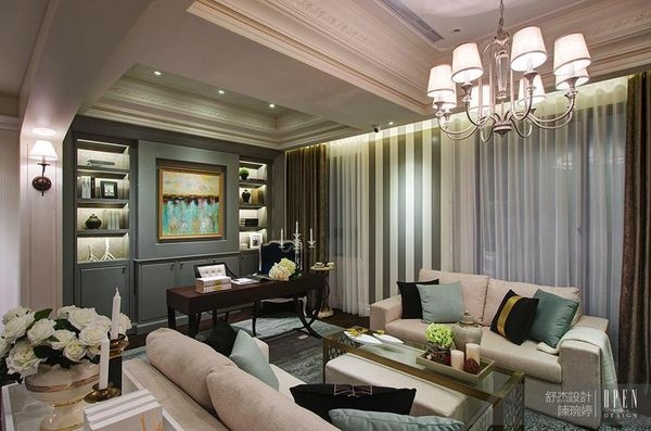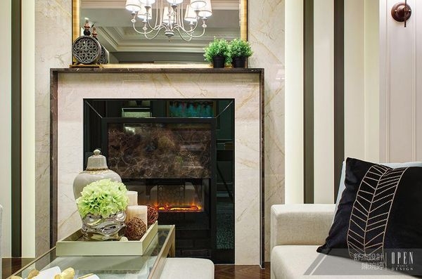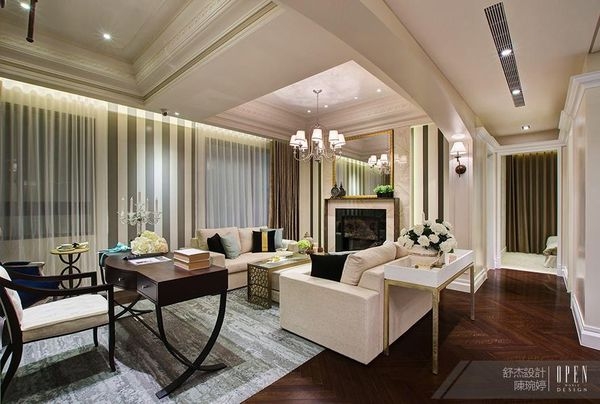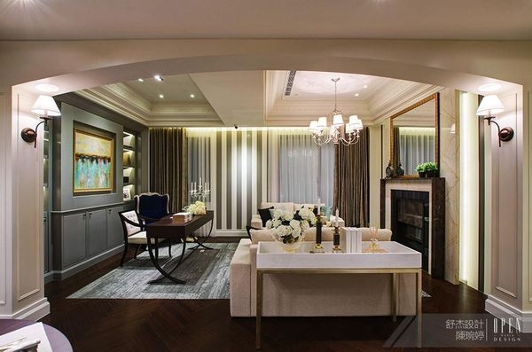 客廳沙發採用對稱手法,搭配上藍綠色及黑色的抱枕,呼應著書房的畫作及整體空間色系;石材主牆加上層次分明的壁爐、精心挑選畫作及DECO,並將一入門的沙發端景也帶入其中,處處展現出主人生活化的品味及喜好,大器典雅的巴黎風格油然而生。