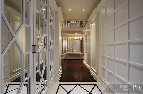 雅緻的氛圍與黑、白、灰筆直線條的低彩度基調下,貫穿整個居家空間,傳達出主人對於生活品味的追求。入口地面石材水切及鏡面造型,加上牆面對稱及木作車溝,映入眼簾呈現出的是主人希望帶給賓客的一種態度、一種品味與藝廊感。在挑高的空間中,搭配精心挑選的銅製布罩吊燈,並在餐廳的天花加上鏡面反射處理,突顯了線板繁複的層次與視覺的質感。