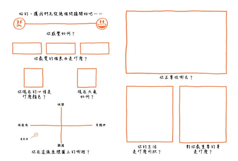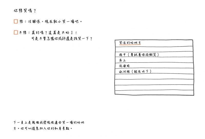 這本書並不能治癒你,也不能讓你感到快樂。但好消息是,沒有一本書可以作到這件事,而你自己也明白這件事。因為你清楚知道,那些像是墜入深淵般的沮喪,是沒有任何一本書可以讓你快樂起來的。但這本書可以讓你透過書寫、塗鴉,幫助你發現與記憶起那些讓你感到快樂的事……或是,可以讓你少難過一點。