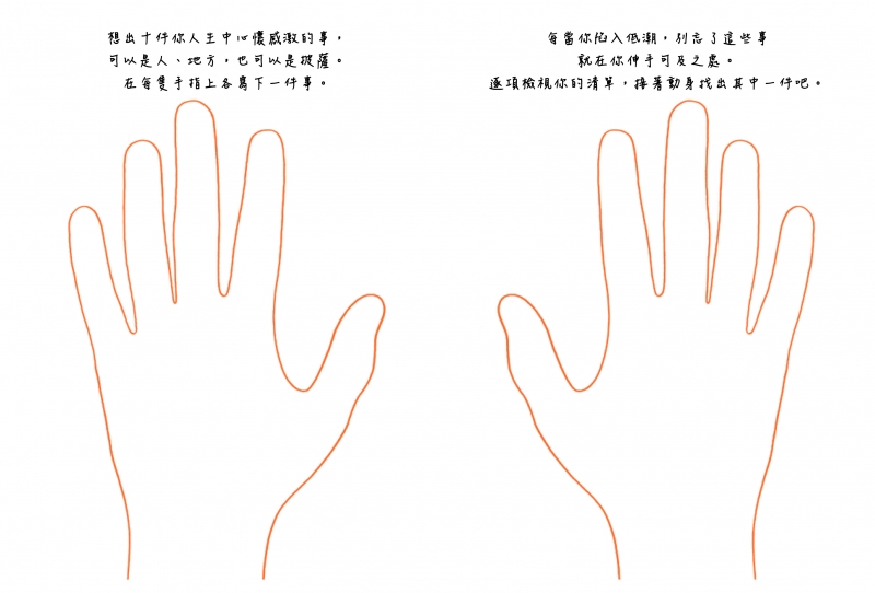 請回想人生中所感謝的十則人、事、物(正好呼應了十隻手指),並將他們寫在每隻手指上,每逢低潮就提醒自己他們就在不遠處,並尋求協助。