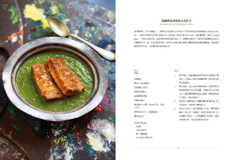 我喜歡單吃「時令燉蔬菜」,這種吃法也比較適合素食者(當然如果吃純素就要確定菜裡沒有加牛奶),不過大多數的匈牙利人都會在菜上面加肉、蛋或其他佐料一起吃,像是漢堡排、燒肉(braised meat)、烤肋排或是煎蛋。菠菜泥的經典配菜是法式吐司,這邊我也跟進了。雖然這份食譜裡菠菜的煮法跟傳統不太一樣,但吃起來更美味、更特別!我用花椰菜泥取代麵粉糊來增加湯的濃稠度,用綠咖哩醬增加辛香口感,也用椰奶取代原本的牛奶。
