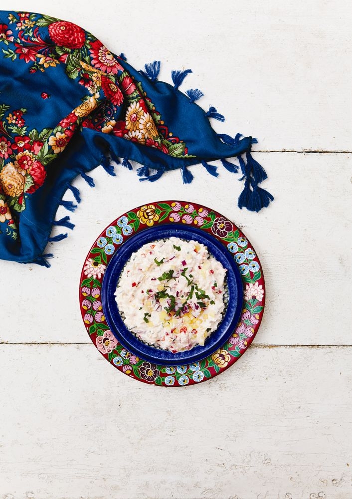 我某次去參加活動時第一次吃到這道抹醬,當時負責提供點心的是一家吉普賽家常餐廳,所以想當然耳他們也有準備吉普賽料理中最有特色的扁麵包(匈牙利人稱之為bodag、vakaró或punya),來搭配匈牙利紅椒燉菜還有這道吉普賽風鮮乾酪抹醬。在把蔬菜拌入抹醬前,他們先擠出蔬菜裡的水分,而我的食譜則是直接加入新鮮蔬菜,再用一半羊奶鮮乾酪、一半牛奶鮮乾酪的組合,呈現出這一道最適合春天的抹醬,抹在土司上吃只有美味可以形容。