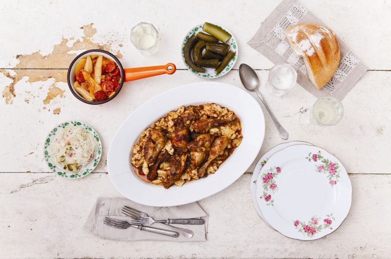這是我最喜歡的一道燉肉,不去皮的雞腿(想要的話也可以加雞腳進去)讓湯汁變得濃醇。跟上一篇的原則一樣,如果加更多水然後最後用酸奶油麵糊勾芡,做出來的成品就是紅椒雞「帕皮卡」。這道嫩雞燉肉的經典配菜是用麵粉和蛋做出來的小麵餃(galuska),再搭配酸奶油小黃瓜沙拉。