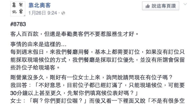 女士:「我哪知道像他們這種餐廳還需要訂位,我以為沒客人,所以根本不需要訂位。」