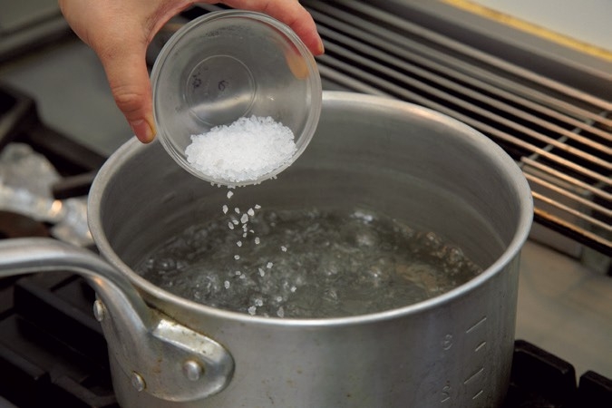 (1)將2L的水煮滾後,放入1大匙粗粒鹽(天然鹽的話為1.5大匙)稍微攪拌。