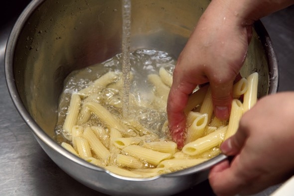 製作「冷麵」時短義大利麵不像長條義大利麵需要「立刻完全降溫」,而是要「逐漸冷卻」才會好吃。建議一開始冷卻時先放入冰塊,接著用流動的開水慢慢降溫。過度冷卻會使口感變得太硬。