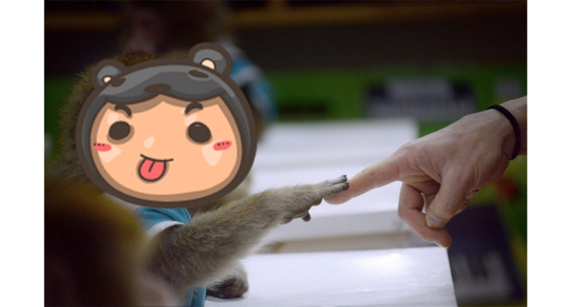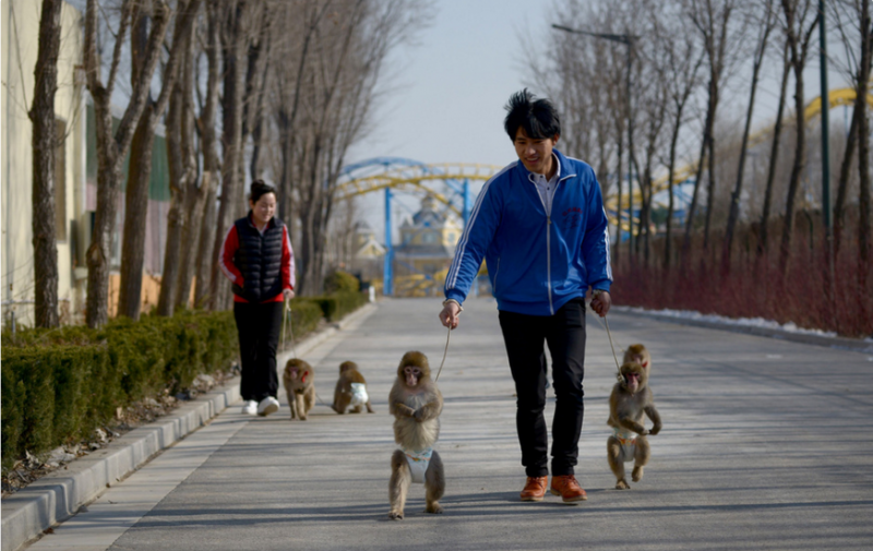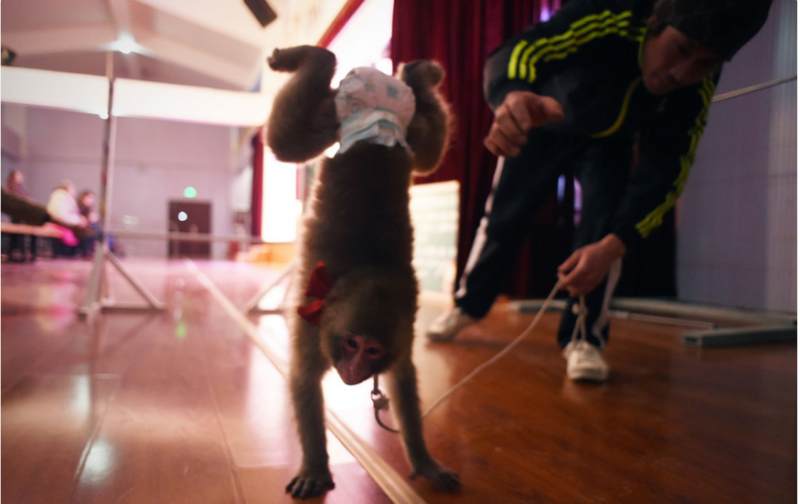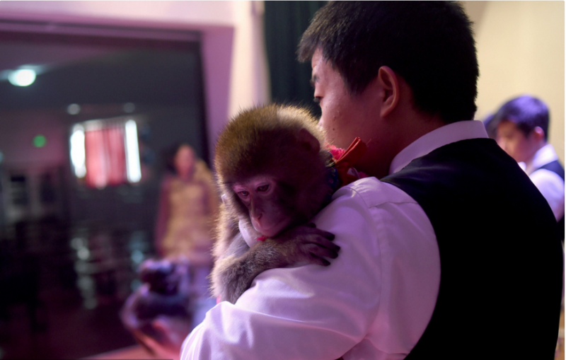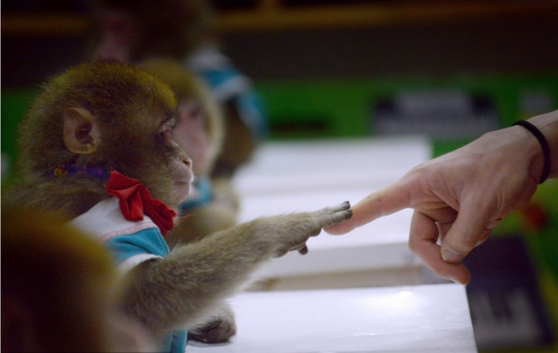 1月26日,山東東營,當地一動物園猴子培訓學校進行綵排,12隻猴子接受訓練將參加猴年慶祝活動。圖為「課堂」上,一隻猴子在配合練習。