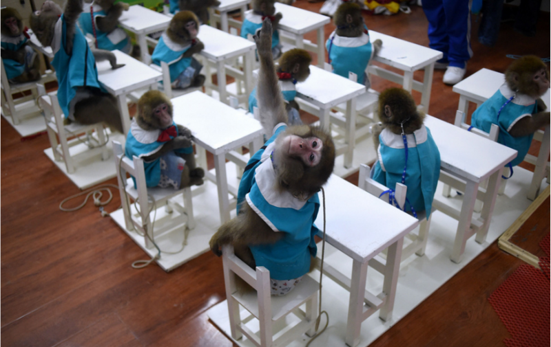 培訓學校為參加猴年慶典進行綵排,12隻猴子經驗有序的坐在課桌前。