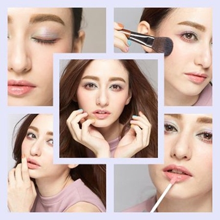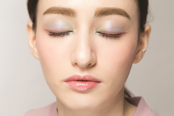 眼部大量使用了繽紛色彩,因此唇部為了平衡妝感,就選擇帶有透明光澤感的蜜桃粉紅色,呈現自然甜美的唇色。
