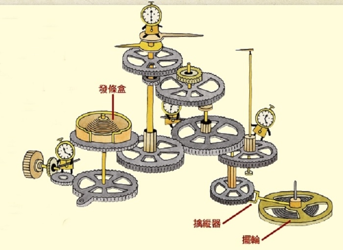 假如是用擺輪來牽動齒輪轉動,為了讓齒輪每次的轉動,都是固定的時間長度,擒縱器會先抓住轉動的齒輪,然後再放開,讓每次轉動的時間都一樣長。擒縱器工作時會發出滴答滴答的響聲,這也是鐘錶與其他計時工具不同之處......