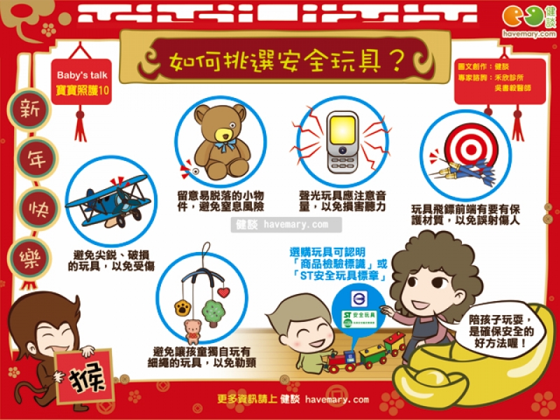 過年又買了不少玩具給家中幼兒嗎?禾欣診所吳書毅醫師提醒,選購玩具可認明「ST安全玩具標章」或美國ASTM、歐盟CE等各國安檢標章,且家長最好陪孩子一同玩耍,是確保安全的最佳良方。