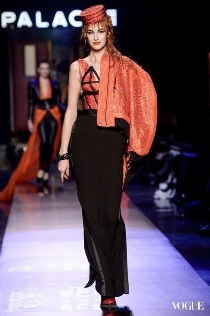 在瘋狂的背後,我像是在人群中看到一個友善的面孔—我看到一件紫紅色的垂墜感洋裝、有著皮革緄邊的以及擁有完美剪裁恰如其分緊貼在肌膚上的滑質睡衣。所以至少我在其中還是看到了尚保羅高提耶Jean Paul Gaultier對高級訂製服裁縫的不可思議天賦,以及法語中所謂的「朦朧(le flou)」,或是說流動性。