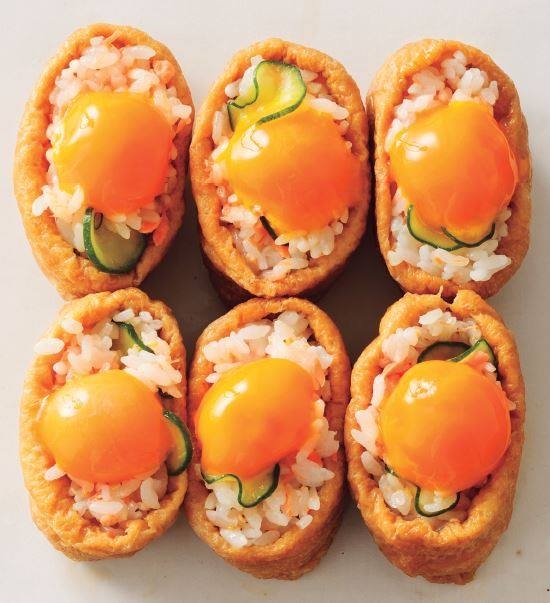 1.冷凍蛋解凍後,將蛋黃和蛋白分開。蛋黃切成兩半。豆皮切成兩半,打開成袋狀。用熱開水汆燙1~2分鐘,以除去油分,然後用篩子撈起放涼。小黃瓜薄切,用少許鹽(不算在材料分量內)揉搓,然後擠出水分。