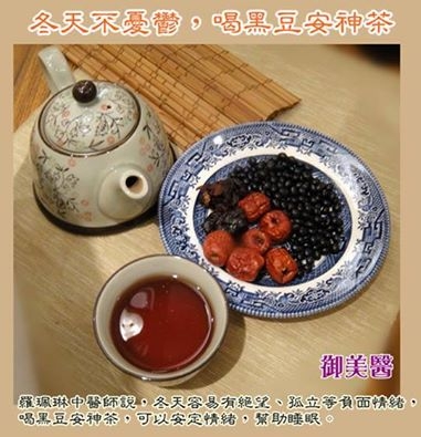 冬天寒冷陰沉,心情容易憂鬱煩惱。御絨中醫診所羅珮琳中醫師說,冬季是收藏的季節,五行養生中,冬天的情緒對應『恐』,對應的五臟是『腎』,所以冬季容易有絕望、孤立等負面情緒,冬季養生情緒宜含蓄保守,不憂鬱、不外露。以下她介紹ㄧ貼黑豆安神茶,以安定情緒,幫助睡眠。