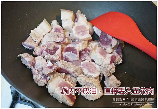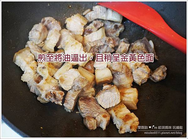 待五花肉煎煮至稍帶金黃色面時,就可以倒醬油下去了!