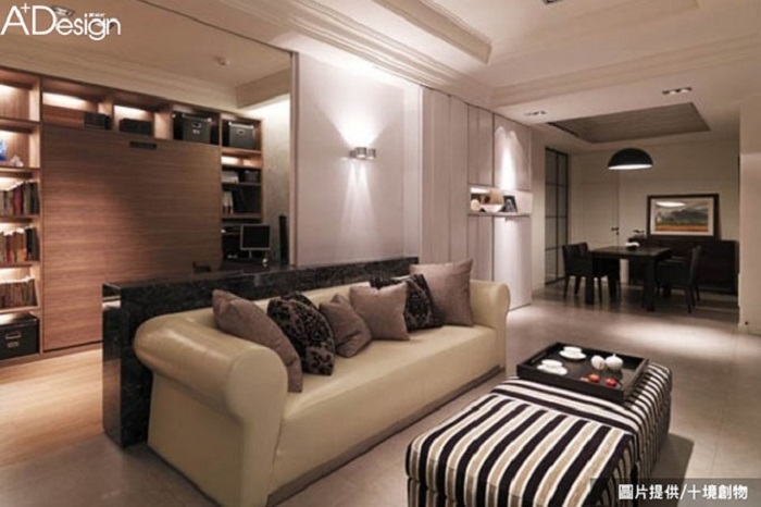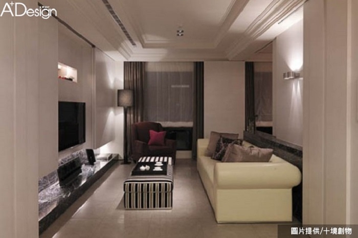 為擴寬26坪小公寓的舒適感,客廳特別配置落地窗,高採光度使得白天無須開燈,另外更特別減少人造間接光源,利用可移動光源如立燈、壁燈等方式塑造情境。謝中泰認為,家就應該是一個能休憩的地方,為構製出這種休閒感,特別以門片遮蓋電視,讓客廳回歸原有的本質—「放鬆」,並屏除繁雜的視聽娛樂,單純於電視牆下擺放一組經典B&O音響,在燈光與低調黑網石的襯托下,演繹著精緻優閒的質感生活。