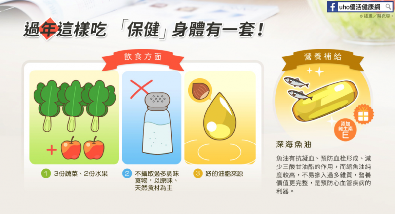 每逢過年,總是少不了年菜佳餚,大魚大肉、山珍海味一上桌,幾乎是來者不拒。過完年後,除了要面對體重機上的數字、體脂的增加,最怕的是連心血管疾病也趁虛而入!究竟過年應該怎麼吃,才不怕疾病找上門呢?彰化基督教醫院蔡怡婷營養師指出,飲食均衡,減少油、鹽、糖攝取,及規律運動才是最好的預防之道!另外,補充保健食品,如魚油、維生素、葉酸等也都有助於心血管疾病的預防。