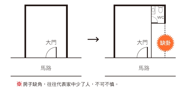 房子原本方方正正,「多此一舉」後,就造成缺卦了!所缺的卦位正是這個房子的長子卦,所以宅主二十五歲的長子在打電腦的時候,趴在桌子睡覺一覺不起,當初這個不幸的案例讓我相當震撼,所以請大家務必小心缺卦的房子。