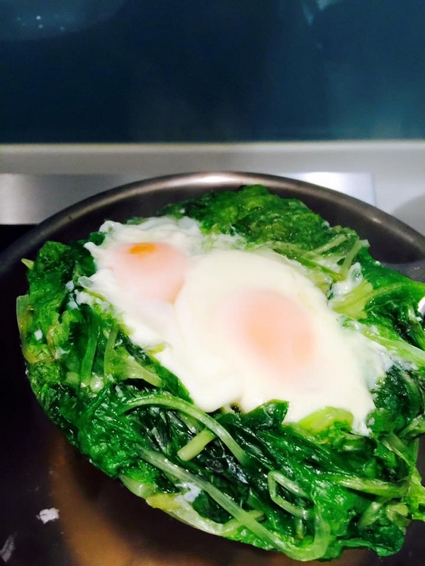 如果有正式晚餐,需要稍微多點變化,這也是一道很漂亮的前菜~可以將青菜稍作修剪,放上小顆一點的雞蛋~在周圍淋上高湯~灑上一滴松露油~