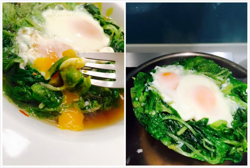 作法:煮一小鍋水(泡麵鍋),跟青菜的比例大約1:4或1:5就夠(是說青菜進水之後縮小的體積喔,不是未煮之前的XD),總之要能蓋過青菜,水煮開放入青菜轉中火,稍微在中間留個位置,打蛋
