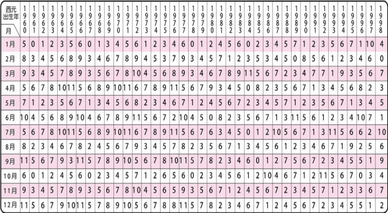 1.請從下表找出你出生年和月交會處的數字。(可以點擊圖片放大觀看)