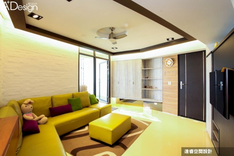 老屋翻新將兩戶一氣呵成的大幅度改建,入口處因充沛露臺日光迎接,也就無需玄關的隔間定位,特地以斜角創意打造電視牆,除了界定出客廳與餐廚空間分界,順勢也將鞋櫃需求一整成型,在搭上芥末黃L型沙發,空間直接跳脫一般的活躍感,活力滿點!