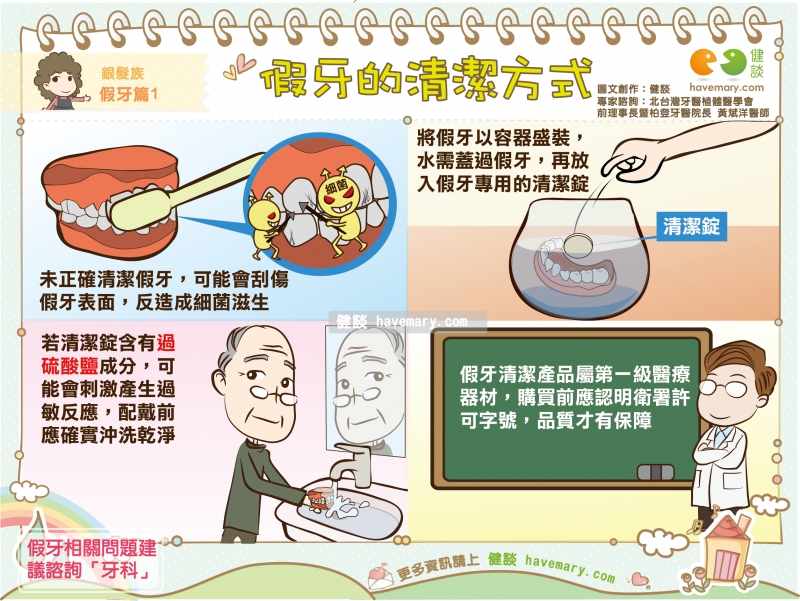 建議以專用的假牙清潔錠,先以藥劑浸泡、再以清水將藥劑洗淨即可。值得注意的是,若假牙清潔成分含有過硫酸鹽(persulfate)者,可能造成刺激或誘發蕁麻疹等過敏反應,建議以容器浸泡後再以清水沖洗才能佩戴使用,以免引起不適。