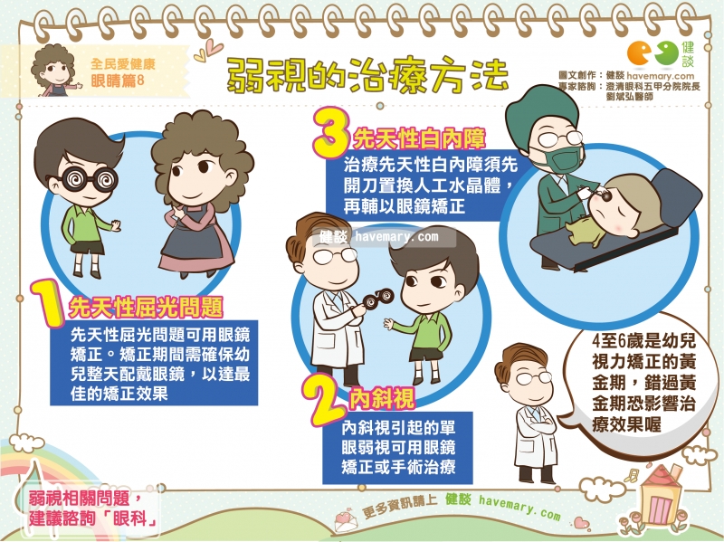 1. 先天性屈光問題:屈光異常的弱視須以眼鏡矯正,讓幼兒的眼睛排除弱視因素後,看到清晰的影像,進一步刺激視力發育,才能改善弱視情況。