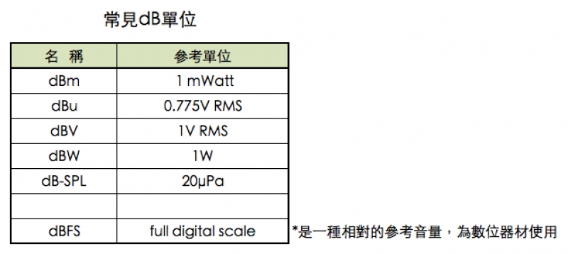 dB是一個相對比較的值,當我們在講音量多少時,要看講的主題是指大氣的壓力、消耗的電功率,或是電壓。聲音還是聲能在空中傳遞時,我們講的是大氣裡的壓力改變;當聲能轉成電能時,它的改變就會用功率(Watts),電壓(Volts)等不同的電學上測量參考單位來表示。簡單來講(因為要講到計算方式會扯到log,有興趣的人就自行上網google了),dB就是在不同情況下,用不同測量參考單位所測出的聲音音量變化值,而常會看到的dBu、dBV、dBFS在dB後面的英文字是代表它用什麼參考單位或是什麼方式去進行測量的。下面的圖表就是常會看到的音量測量參考單位。