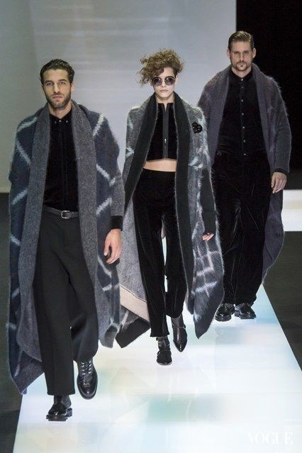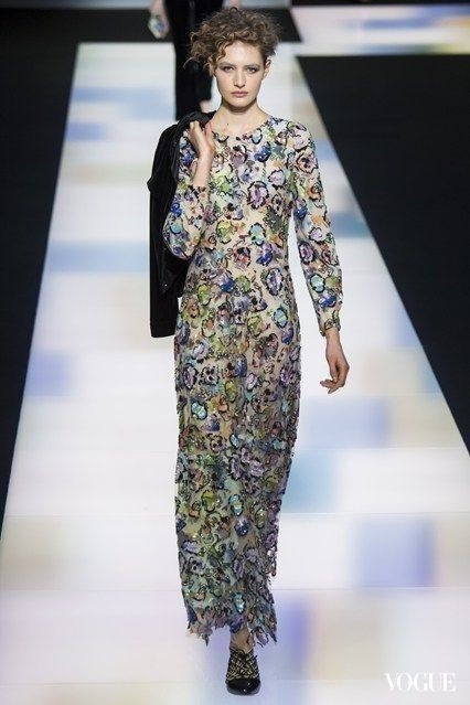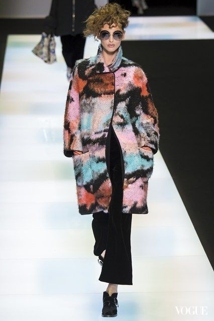 這場時裝秀充滿了Armani的元素。他表達了構想,也為時裝秀製造驚喜,像是一件上面濺滿藝術性的圖案寬大衣。