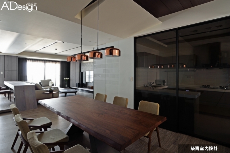 不喜油煙亂竄的屋主,在廚房吧檯外特意加裝黑玻璃滑門阻絕烹飪時的油煙氣味。廚房邊白牆及櫃體上加貼白色烤漆玻璃亦可作為記事或塗鴉的用途,生活大小事一眼明瞭。