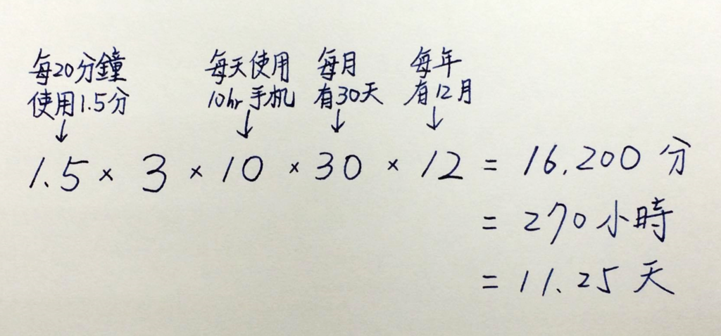 假設每20分鐘低頭用手機1.5分鐘,
