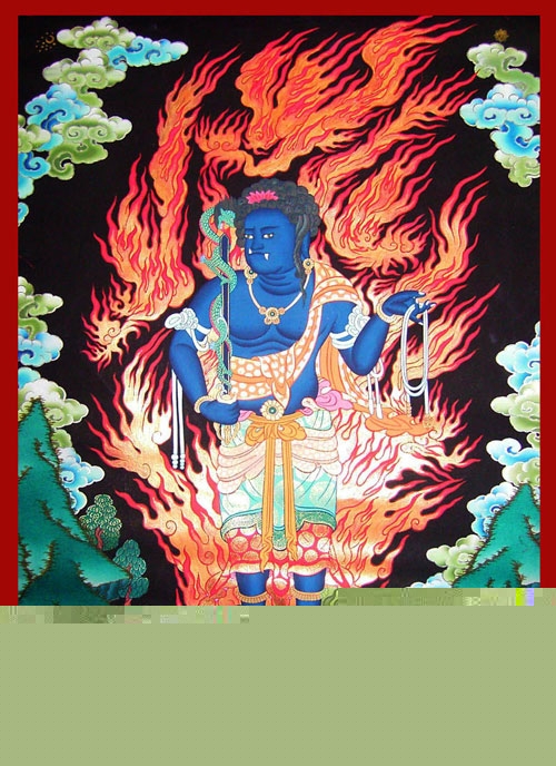 不動尊菩薩,其名號梵音為Acalanatha,意為不動尊或無動尊,教界稱為“不動明王”,亦謂之不動使者。“不動”,乃指慈悲心堅固,無可撼動,“明”者,乃智慧之光明,“王”者,駕馭一切現象者。依密教三輪身之分類而總判,不動明王為一切諸佛教令輪身,故又稱為諸明王之王,五大明王之主尊。就金剛胎藏兩部而分別其德,五方佛,各有三輪身。中央毗如遮那佛為自性輪身,金剛般若蜜多菩薩為正身,不動明王為教令輪身。所以不動明王是奉大日如來教令,示現忿怒形降伏一切惡魔之大威勢明王。他的身相是對那些頑固不化、執迷不誤、受魔障遮蔽的眾生而變化的,以喝醒眾生和嚇退魔障。