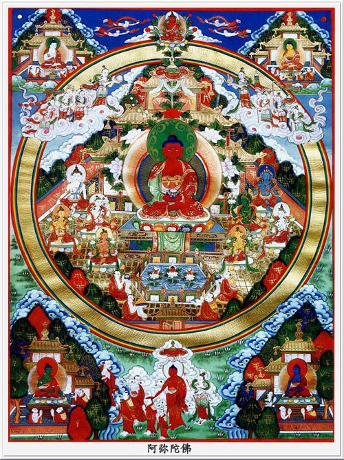 阿彌陀佛為西方極樂淨土世界的教主,以無盡願力誓渡一切眾生,不舍悲願,以無量光明照獨行者,業障重罪皆可消減,凡持其名號者,生前獲佛護佑,消除一切災禍業苦;死後更可化生其極樂淨土,得享一切安樂。